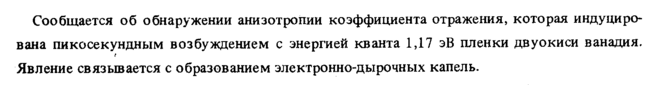 Сообщается об обнаружении анизотропии коэффициента отражения, которая индуцирована пикосекундным возбуждением с энергией кванта 1,17 эВ пленки двуокиси ванадия, Явление связывается с образованием электронно-дырочных капель.