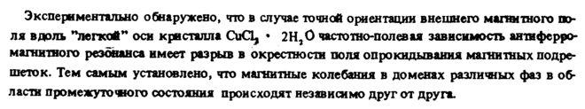 Экспериментально обнаружено, что в случае точной ориентации внешнего магнитного поля вдоль "легкой" оси кристалла CuCL, · 2Н,0 частотно-полевая зависимость антиферромагнитного резонанса имеет разрыв в окрестности поля опрокидывания магнитных подре-шеток. Тем самым установлено, что магнитные колебания в доменах различных фаз в области промежуточного состояния происходят независимо друг от друга.