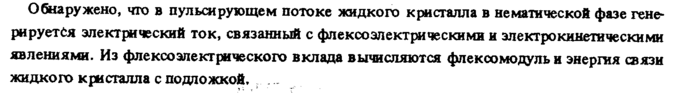 Обнаружено, что в пульсирующем потоке жидкого кристалла в не магической фазе генерируется электрический ток, связанный с флексоэлектрическими и электрокинетическими явлениями. Из флексо электрического вклада вычисляются флексо модуль и энергия связи жидкого кристалла с подложкой, .. -