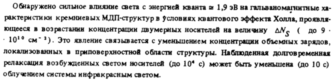 Обнаружено сильное влияние света с энергией кванта г 1,9 эВ на гальваномагнитные характеристики кремниевых МДП-структур в условиях квантового эффекта Холла, проявляющееся в возрастании концентрации двумерных носителей на величину ΔΛ^ ( до 9 · • 1010 см" *). Это явление связывается с уменьшением концентрации объемных зарядов, локализованных в приповерхностной области структуры. Наблюденная долговременная релаксация возбужденных светом носителей (до 104 с) может быть уменьшена (до 10 с) облучением системы инфракрасным светом.