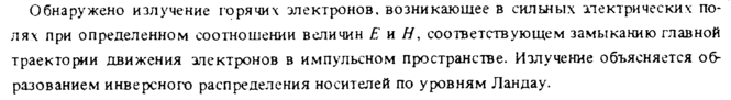 Обнаружено излучение горячих электронов, возникающее в сильных электрических полях при определенном соотношении величин Ε и Я, соответствующем замыканию главной траектории движения электронов в импульсном пространстве. Излучение объясняется образованием инверсного распределения носителей по уровням Ландау.