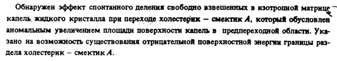Обнаружен эффект спонтанного деления свободно взвешенных в изотропной матрицу' капель, жидкого кристалла при переходе холестернк смектик А, который обусловлен аномальным увеличением площади поверхности капель в предпереходной области. Указано на возможность существования отрицательной поверхностной энергии границы раздела холестерик смектик А.
