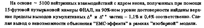 На основе ~ 5100 нейтринных взаимодействий с ядром неона, полученных при помощи 15-футовоЙ пузырьковой камеры ФНАЛ, на 90%-ном уровне достоверности найдены верхние пределы выходов кумулятивных Δ0 и Δ** частиц 1,1% и 0,4% соответственно. Сделан вывод о невозможности объяснения "ЕМС-эффекта" в рамках "изобарной" модели.