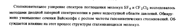 Столкновительное уширение спектров поглощения молекул SF$ и CF2Cl2 исследовалось методами диодной лазерной спектроскопии в ранее недоступной области давлений. Обнаружено уменьшение сечения Вайскопфа с ростом частоты газо кинетически χ столкновений. Обсуждается влияние на этот процесс структуры сталкивающихся молекул.