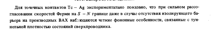 Для точечных контактов Тс Ag экспериментально показано, что при сильном рассогласовании скоростей Ферми на S N границе даже в случае отсутствия изолирующего барьера на производных ΒΑΧ наблюдаются четкие фононные особенности, связанные с туннельной плотностью состояний сверхпроводника.