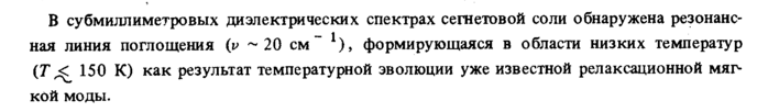 В субмиллиметровых диэлектрических спектрах сегнетовой соли обнаружена резонансная линия поглощения (и ~ 20 см" формирующаяся в области низких температур {Т < 150 К) как результат температурной эволюции уже известной релаксационной мяг- ^^^^ кой моды.