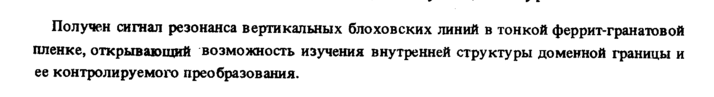 Получен сигнал резонанса вертикальных блоховских линий в тонкой феррит-гранатовой пленке, открывающий возможность изучения внутренней структуры доменной границы и ее контролируемого преобразования.