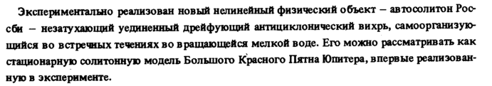Экспериментально реализован новый нелинейный физический объект автосолитон Рос-сби незатухающий уединенный дрейфующий антициклонический вихрь, самоорганизующийся во встречных течениях во вращающейся мелкой воде. Его можно рассматривать как стационарную солитонную модель Большого Красного Пятна Юпитера, впервые реализованную в эксперименте.