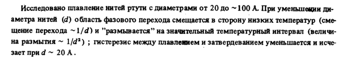 Исследовано плавление нитей ртути с диаметрами от 20 до ~ 100 А. При уменьшении диаметра нитей (d) область фазового перехода смещается в сторону низких температур (смещение перехода ~1/<Я и "размывается" на значительный температурный интервал (величина размытия ~ X/d2) ; гистерезис между плавлением и затвердеванием уменьшается и исчезает при d ~ 20 А.