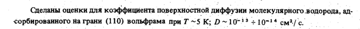 Сделаны оценки для коэффициента поверхностной диффузии молекулярного .водорода, адсорбированного на грани (110) вольфрама при Τ ~5 К; D Ю~1 * 10"14 см2 / с.