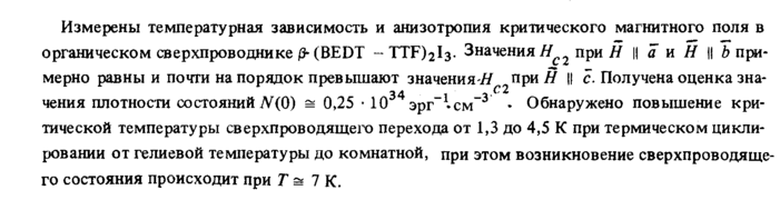 Измерены температурная зависимость и анизотропия критического магнитного поля в органическом сверхпроводнике β· (BEDT -TTF)2I3. Значения Η£2 при Я || а и Я I! bпримерно равны и почти на порядок превышают значения-Я^при Я || с. Получена оценка значения плотности состояний W(0) ^ 0,25 · 1034эрг-1.см~3 · Обнаружено повышение критической температуры сверхпроводящего перехода от 1,3 до 4,5 К при термическом цикли-ровании от гелиевой температуры до комнатной, при этом возникновение сверхпроводящего состояния происходит при Τ ^ 7 К.