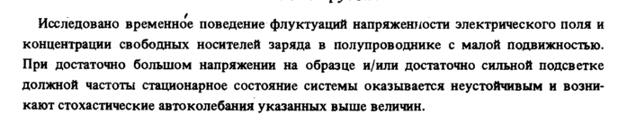 Исследовано временное поведение флуктуаций напряженности электрического поля и концентрации свободных носителей заряда в полупроводнике с малой подвижностью. При достаточно большом напряжении на образце и/или достаточно сильной подсветке должной частоты стационарное состояние системы оказывается неустойчивым и возникают стохастические автоколебания указанных выше величин.