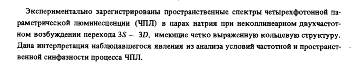 Экспериментально зарегистрированы пространственные спектры четырехфотонной параметрической люминесценции (ЧПЛ) в парах натрия при неколлинеарном двухчастот-ном возбуждении перехода 35 3D, имеющие четко выраженную кольцевую структуру. Дана интерпретация наблюдавшегося явления из анализа условий частотной и пространственной синфазности процесса ЧПЛ.
