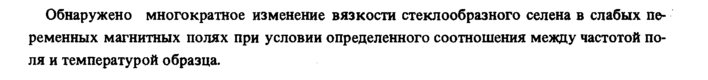 Обнаружено многократное изменение вязкости стеклообразного селена в слабых переменных магнитных полях при условии определенного соотношения между частотой поля и температурой образца.
