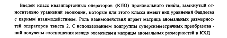 Введен класс квазипартонных операторов (КПО) произвольного твиста, замкнутый относительно уравнений эволюции, которые для этого класса имеют вид уравнений Фаддеева с парным взаимодействием. Роль взаимодействия играет матрица аномальных размерностей операторов твиста 2. С использованием подгруппы суперсимметричных преобразова -ний получены соотношения между элементами матрицы аномальных размерностей в КХД