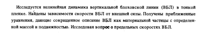 Исследуется нелинейная динамика вертикальной блоховской линии (ВБЛ) в тонкой пленке. Найдены зависимости скорости ВБЛ от внешней силы. Получены приближенные уравнения, дающие сокращенное описание ВБЛ как материальной частицы с определенной массой и подвижностью. Исследован вопрос о предельных скоростях ВБЛ.