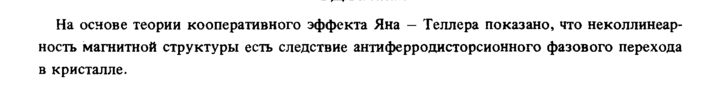 На основе теории кооперативного эффекта Яна — Теллера показано, что неколлинеарность магнитной структуры есть следствие антиферродисторсионного фазового перехода в кристалле.