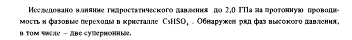 Исследовано влияние гидростатического давления до 2,0 ГПа на протонную проводимость и фазовые переходы в кристалле CsHS04 . Обнаружен ряд фаз высокого давления, в том числе две суперионные.