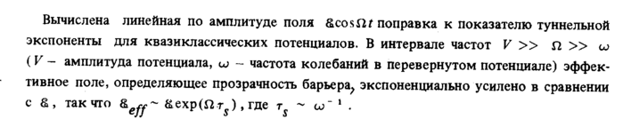 Вычислена линейная по амплитуде поля &cosm поправка к показателю туннельной экспоненты для квазиклассических потенциалов. В интервале частот V » Ω » ω ( V амплитуда потенциала, ω частота колебаний в перевернутом потенциале) эффективное поле, определяющее прозрачность барьера, экспоненциально усилено в сравнении с £, так что &eff~ &ехр(Пту), где т$ ω~ 1 .