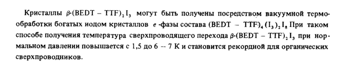 Кристаллы j3-(BEDT TTF)213 могут быть получены посредством вакуумной термообработки богатых иодом кристаллов е -фазы состава (BEDT TTF)4(I3)2I8 При таком способе получения температура сверхпроводящего перехода 0-(BEDT TTF)2I3 при нормальном давлении повышается с 1,5 до 6 7 К и становится рекордной для органических сверхпроводников.