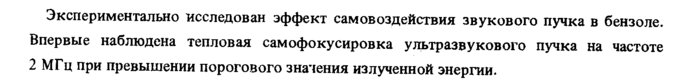Экспериментально исследован эффект самовоздействия звукового пучка в бензоле. Впервые наблюдена тепловая самофокусировка ультразвукового пучка на частоте 2 МГц при превышении порогового значения излученной энергии.