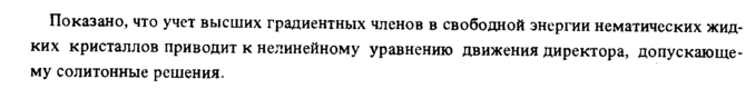 Показано, что учет высших градиентных членов в свободной энергии нематических жидких кристаллов приводит к нелинейному уравнению движения директора, допускающему солитонные решения.