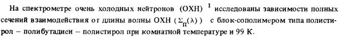 На спектрометре очень холодных нейтронов (ОХН) исследованы зависимости полных сечений взаимодействия от длины волны ОХН (^π(λ)) с блок-сополимером типа полистирол поли бутадиен полистирол при комнатной температуре и 99 К.