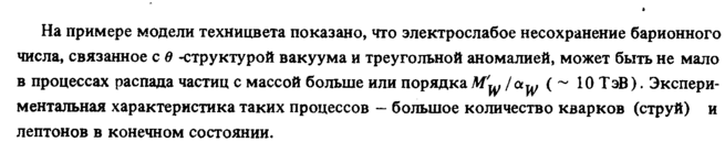 На примере модели техницвета показано, что электрослабое несохранение барионного числа, связанное с θ -структурой вакуума и треугольной аномалией, может быть не мало в процессах распада частиц с массой больше или порядка М'^ /а^ (~ 10 ТэВ). Экспериментальная характеристика таких процессов — большое количество кварков (струй) и пептонов в конечном состоянии.
