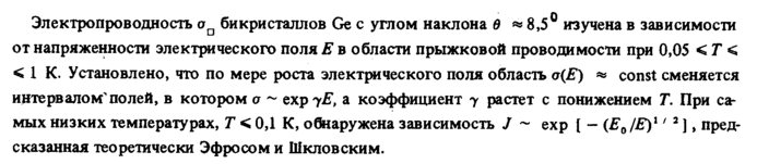 Электропроводность oQ бикристаллов Ge с углом наклона θ «8,5 изучена в зависимости от напряженности электрического поля Ε в области прыжковой проводимости при 0,05 < Τ < < 1 К. Установлено, что по мере роста электрического поля область σ(Ε) * const сменяется интерв ало м^ полей, в котором о ~ ехр7/Г, а коэффициент у растет с понижением Т. При самых низких температурах, Τ < ОД К, обнаружена зависимость / ~ ехр [ (Е0/Е)1' 2 ], предсказанная теоретически Эфросом и Шкловским.