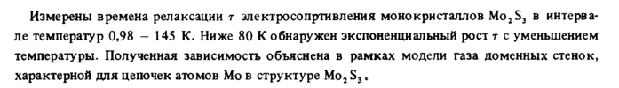 Измерены времена релаксации г электросопртивления монокристаллов Mo2S3 в интервале температур 0,98 145 К. Ниже 80 К обнаружен экспоненциальный рост τ с уменьшением температуры. Полученная зависимость объяснена в рамках модели газа доменных стенок, характерной для цепочек атомов Мо в структуре Мо2 S3»