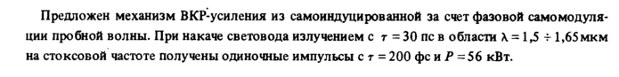 Предложен механизм ВКР-усиления из самоиндуцированной за счет фазовой самомодуляции пробной волны. При накаче световода излучением с г = 30 пс в области λ = 1,5 -f 1,65мкм на стоксовой частоте получены одиночные импульсы с г = 200 фс и Ρ =56 кВт.