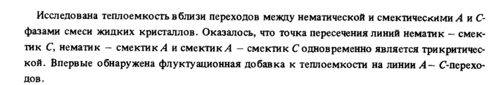 Исследована теплоемкость вблизи переходов между нематической и смектическими А и С-фазами смеси жидких кристаллов. Оказалось, что точка пересечения линий нематик — смек-тик С, нематик смектик А и смектик Л смектик С одновременно является трикритичес-кой. Впервые обнаружена флуктуационная добавка к теплоемкости на линии АС-перехо-дов.
