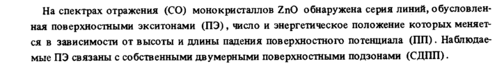 На спектрах отражения (СО) монокристаллов ZnO обнаружена серия линий, обусловленная поверхностными экситонами (ПЭ), число и энергетическое положение которых меняется в зависимости от высоты и длины падения поверхностного потенциала (ПП). Наблюдаемые ПЭ связаны с собственными двумерными поверхностными подзонами (СДПП).