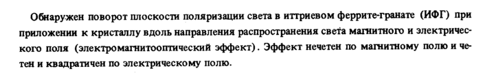 Обнаружен поворот плоскости поляризации света в иттриевом феррите-гранате (ИФГ) при приложении к кристаллу вдоль направления распространения света магнитного и электрического поля (электромагнитооптический эффект). Эффект нечетен по магнитному полю и четен и квадратичен по электрическому полю.