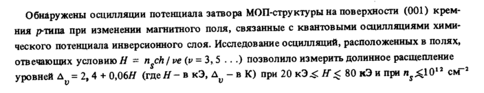 Обнаружены осцилляции потенциала затвора МОП-структуры на поверхности (001) кремния ртипа при изменении магнитного поля, связанные с квантовыми осцилляциями химического потенциала инверсионного слоя. Исследование осцилляций, расположенных в полях, отвечающих условию Я = n^chjve (и = 3,5 ...) позволило измерить долинное расщепление уровней Δ = 2, 4 + 0,06Я (гдеЯв кЭ, в К) при 20 кЭ^ W ζ 80 кЭ и при и,£10" см"2