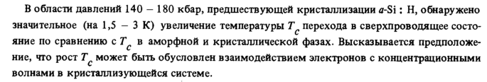 В области давлений 140 180 кбар, предшествующей кристаллизации a-Si: Η, обнаружено значительное (на 1,5 — 3 К) увеличение температуры Τ перехода в сверхпроводящее состо-яние по сравнению с Г в аморфной и кристаллической фазах. Высказывается предположе-ние, что рост Τ' может быть обусловлен взаимодействием электронов с концентрационными волнами в кристаллизующейся системе.