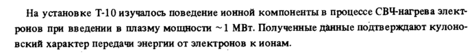 На установке T-10 изучалось поведение ионной компоненты в процессе СВЧ-нагрева электронов при введении в плазму мощности ~1 МВт. Полученные данные подтверждают кулоно-вский характер передачи энергии от электронов к ионам.