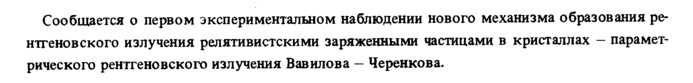 Сообщается о первом экспериментальном наблюдении нового механизма образования рентгеновского излучения релятивистскими заряженными частицами в кристаллах параметрического рентгеновского излучения Вавилова — Черенкова.