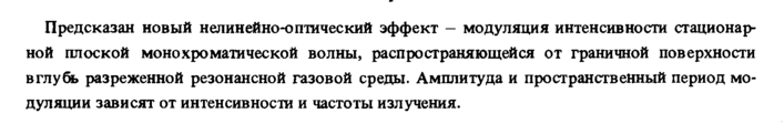 Предсказан новый нелинейно-оптический эффект — модуляция интенсивности стационарной плоской монохроматической волны, распространяющейся от граничной поверхности вглубь разреженной резонансной газовой среды. Амплитуда и пространственный период модуляции зависят от интенсивности и частоты излучения.