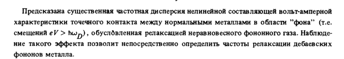 Предсказана существенная частотная дисперсия нелинейной составляющей вольт-амперной характеристики точечного контакта между нормальными металлами в области "фона" (т.е. смещений eV > Ъь>д)9 обусловленная релаксацией неравновесного фононного газа. Наблюдение такого эффекта позволит непосредственно определить частоты релаксации дебаевских фононов металла.