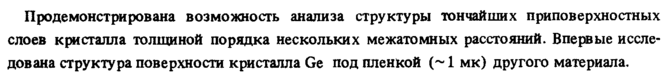 Продемонстрирована возможность анализа структуры тончайших приповерхностных слоев кристалла толщиной порядка нескольких межатомных расстояний. Впервые исследована структура поверхности кристалла Ge под пленкой (~ 1 мк) другого материала.