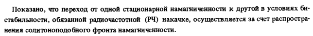 Показано, что переход от одной стационарной намагниченности к другой в условиях би-стабильности, обязанной радиочастотной (РЧ) накачке, осуществляется за счет распространения солитоноподо бного фронта намагниченности.