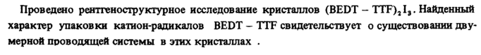 Проведено рентгеноструктурное исследование кристаллов (BEDT TTF)213. Найденный характер упаковки катион-радикалов BEDT TTF свидетельствует о существовании двумерной проводящей системы в этих кристаллах .