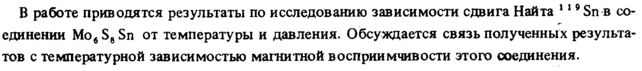 В работе приводятся результаты по исследованию зависимости сдвига Найта 119 Sn в соединении Ыо6 S8 Sn от температуры и давления. Обсуждается связь полученных результатов с температурной зависимостью магнитной восприимчивости этого соединения.