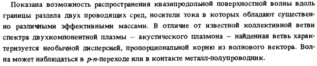 Показана возможность распространения квази про дольной поверхностной волны вдоль границы раздела двух проводящих сред, носители тока в которых обладают существенно различными эффективными массами. В отличие от известной коллективной ветви спектра двухкомпонентной плазмы акустического плазмона найденная ветвь характеризуется необычной дисперсией, пропорциональной корню из волнового вектора. Волна может наблюдаться в р-п-переходе или в контакте металл-полупроводник.