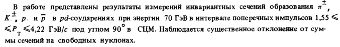 + В работе представлены результаты измерений инвариантных сечений образования π K~t р. ά ρ в pd-co у дарениях при энергии 70 ГэВ в интервале поперечных импульсов 1,55 ^ <Рт <4,22 ГэВ/с под углом 90° в СЦМ. Наблюдается существенное отклонение от суммы сечений на свободных нуклонах.