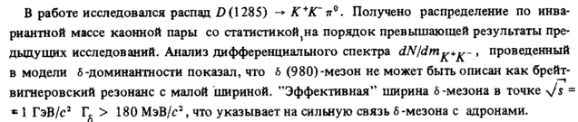 В работе исследовался распад Ζ)(1285) -+ Κ*Κ~π°. Получено распределение по инвариантной массе каонной пары со статистикойгна порядок превышающей результаты предыдущих исследований. Анализ дифференциального спектра dN/dntg+g, проведенный в модели δ-доминантности показал, что δ (980)-мезон не может быть описан как брейт-вигнеровский резонанс с малой шириной, "Эффективная" ширина δ -мезона в точке \Js = * 1 ГэВ/с2 ГЛ > 180 МэВ/с2, что указывает на сильную связь δ-мезона с адронами.