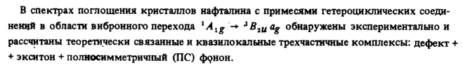 В спектрах поглощения кристаллов нафталина с примесями гетероциклических соединений в области вибронного перехода xAxg'~+ AB2Uag обнаружены экспериментально и рассчитаны теоретически связанные и квазилокальные трехчастичные комплексы: дефект + + экситон + полносимметричный (ПС) фонон.