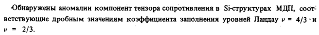 Обнаружены аномалии компонент тензора сопротивления в Si-структурах МДП, соот-" ветствующие дробным значениям коэффициента заполнения уровней Ландау и = 4/3 *и ν = 2/3.