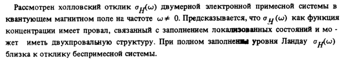 Рассмотрен холловский отклик ο^ώ) двумерной электронной примесной системы в квантующем магнитном поле на частоте ω Φ 0. Предсказывается, что σ^(ω) как функция концентрации имеет провал, связанный с заполнением локализованных состояний и мо -жет иметь двухп ρ овальную структуру. При полном заполнений уровня Ландау σ^ω) близка к отклику беспримесной системы.